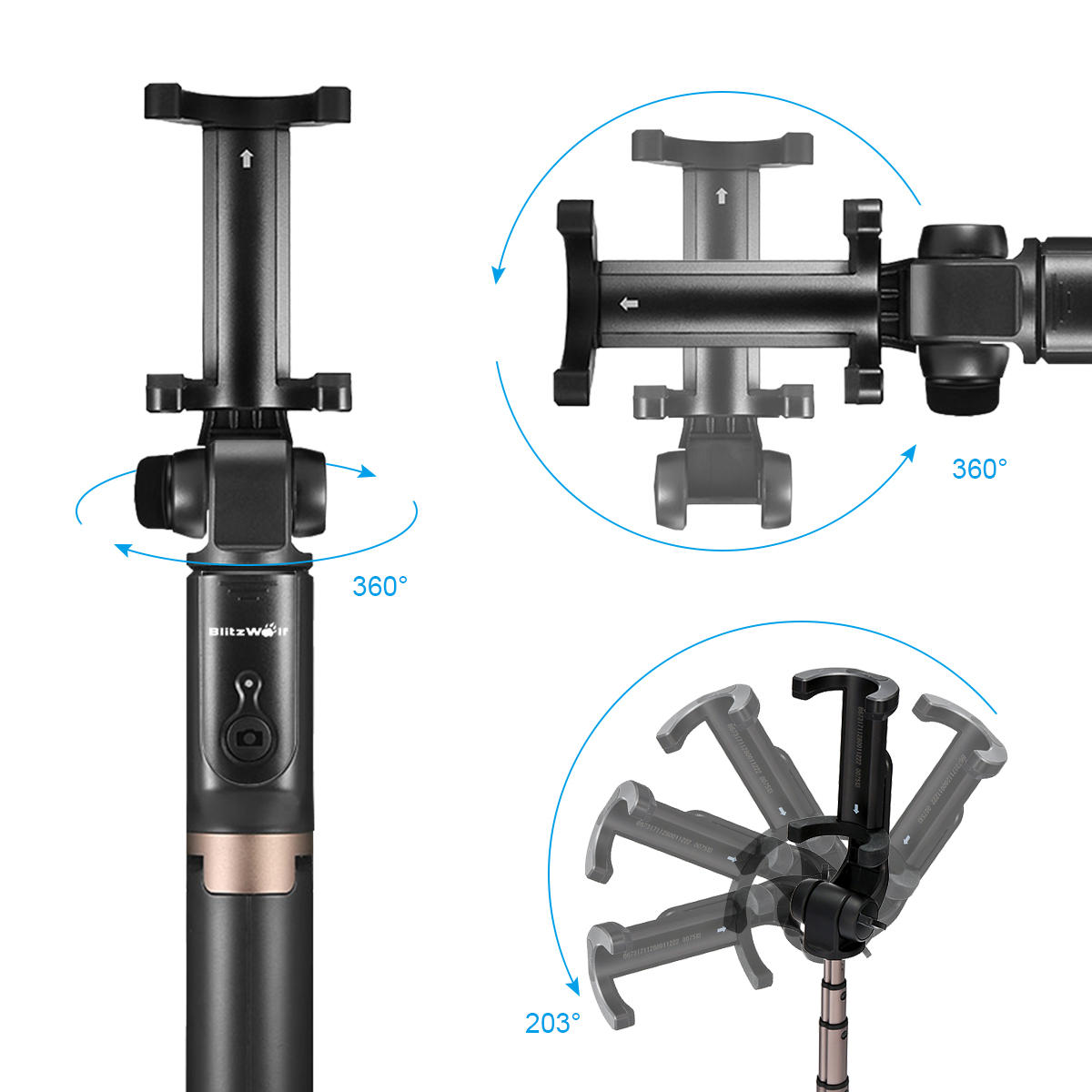 The head of the selfie stick can rotate a full 360 degrees for capturing the perfect shot. The clamp can also be rotated up to 203 degrees. We built the BS3 to fit almost every device with a 3.5-6 inch screen and the remote control requires no extra APP.