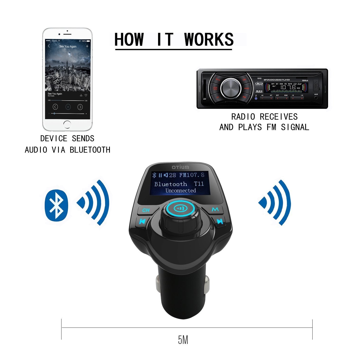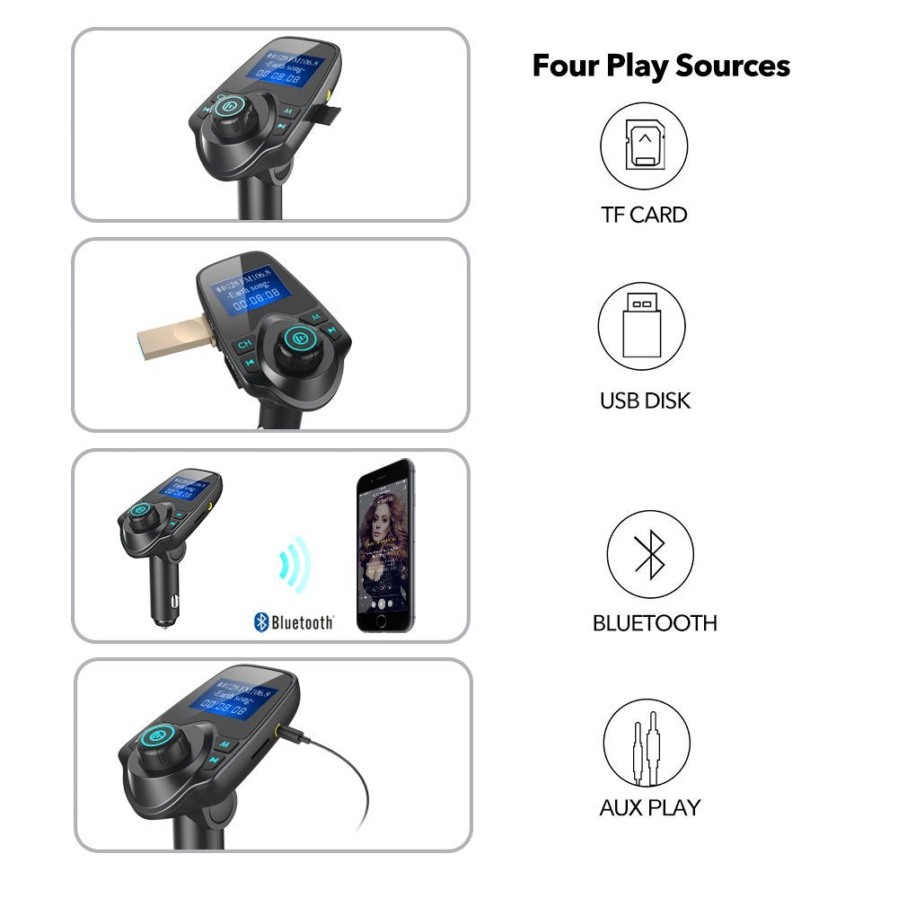 iSunnao Bluetooth Car Kit Adapter streams the music/audio from your phone, tablet, MP3, MP4, TF card, and USB flash disk to the car stereo system.